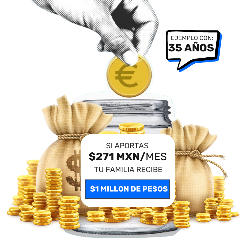 *El presente ejemplo corresponde a una cotización para una persona de 35 años de edad con una aportación mensual de $271 MXN, proyectando un beneficio de $1,000,000 MXN. Las cantidades pueden variar en función de la cobertura seleccionada y las necesidades particulares del contratante.